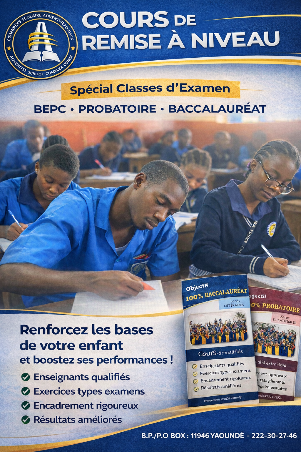 Chaque année, de nombreux élèves rencontrent des difficultés, non pas par manque d’intelligence, mais par une préparation insuffisante ou inadaptée. Au Complexe Scolaire Adventiste d’Odza (CSAO), nous mettons à votre disposition une solution efficace pour accompagner votre enfant vers la réussite. Des cours de remise à niveau intensifs. Nous organisons des sessions de remise à niveau spécialement conçues pour les élèves en classes d’examen :
